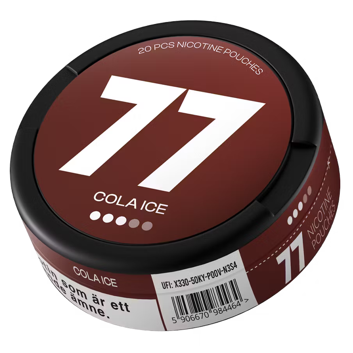 77 Cola Ice 10,4 mg har en smak av kylande cola. Produkten är av sorten vitt snus vars dosa innehåller 20 vita prillor. Styrkan karaktäriseras som stark.