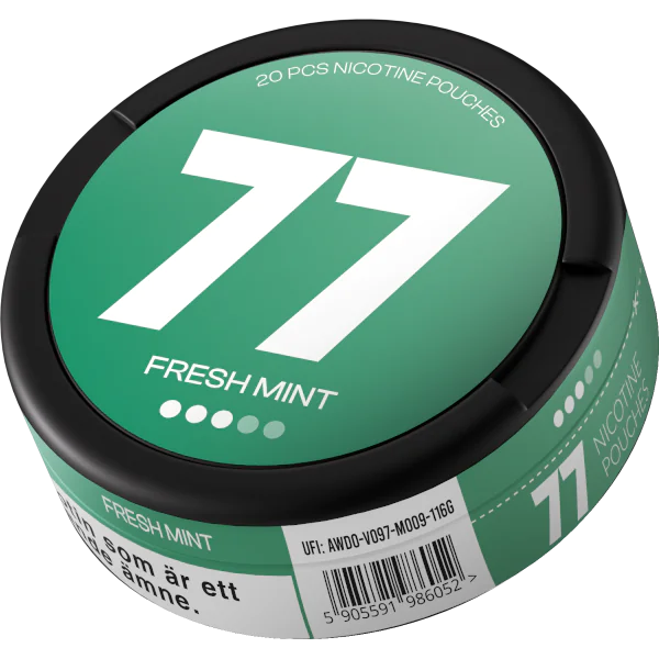 77 Fresh Mint 10,4 mg har en smak av kylande mint. Produkten är av sorten vitt snus vars dosa innehåller 20 vita prillor. Styrkan karaktäriseras som stark.