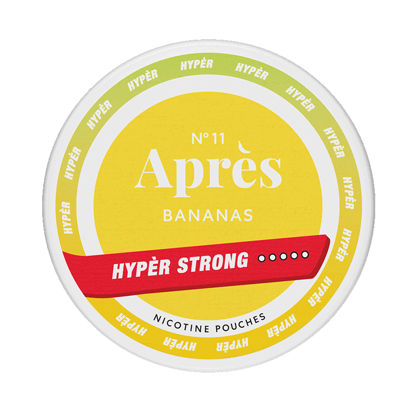 Après Bananas Hypèr Strong N°11 är nikotinpåsar fria från tobak. Detta vita snus har smak av banan. Styrkan är extra stark och formatet är slim.