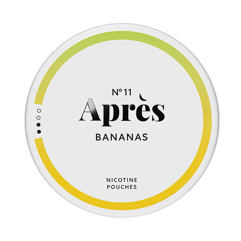 Après Bananas N°11 är nikotinpåsar fria från tobak. Detta vita snus har smak av banan. Styrkan är normal och formatet är slim.