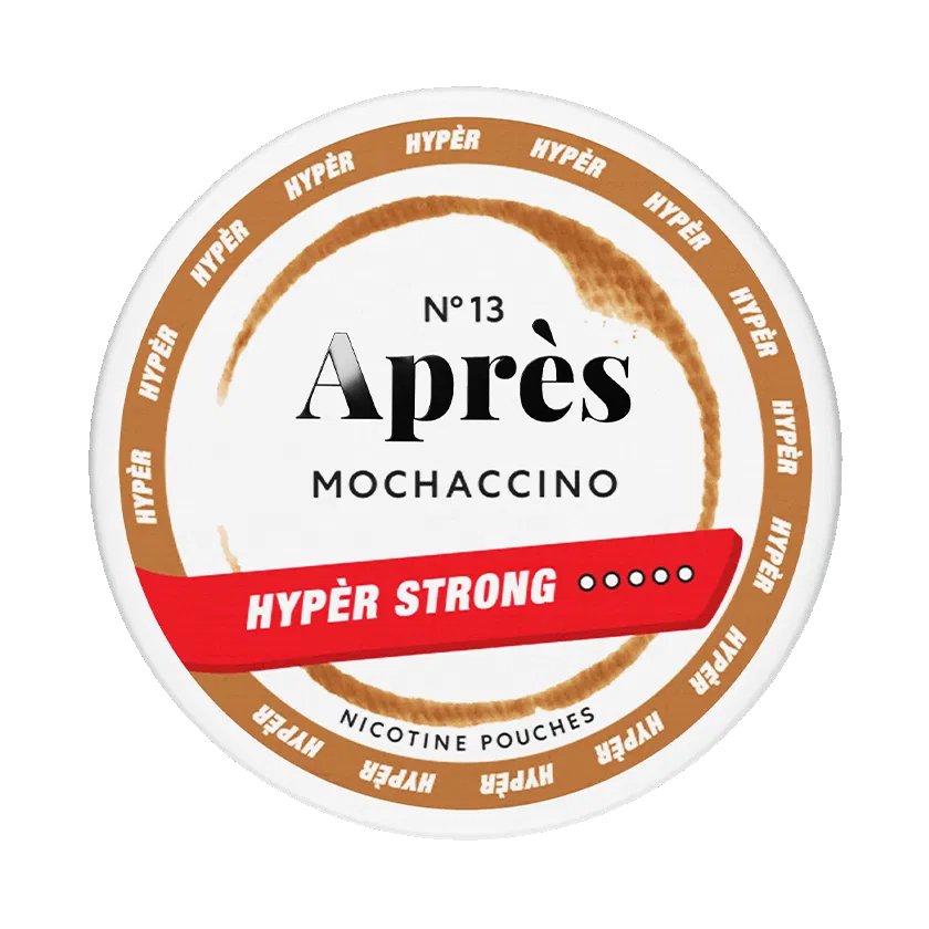 Après Mochaccino Hypèr Strong N°13 är ett vitt snus, fritt från tobak. Styrkan är extra stark och formatet är slim. Smak av kaffe.
