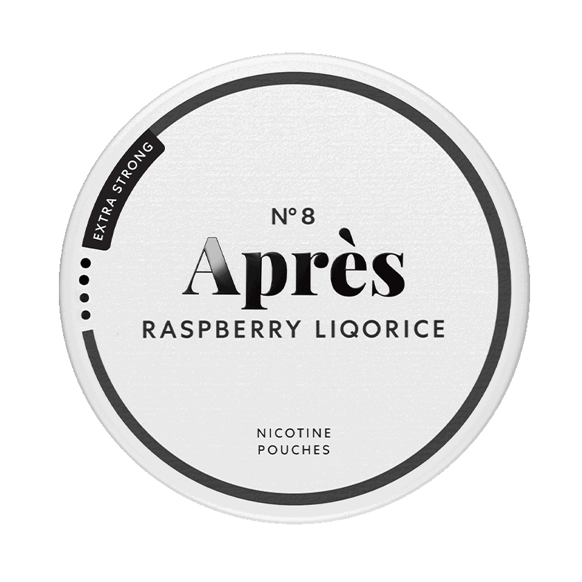 Après Raspberry Liqorice Extra Strong N°8 är ett vitt snus med smak av hallon och lakrits. Styrkan är extra stark och formatet är slim. Varje dosa innehåller 20 st portioner.