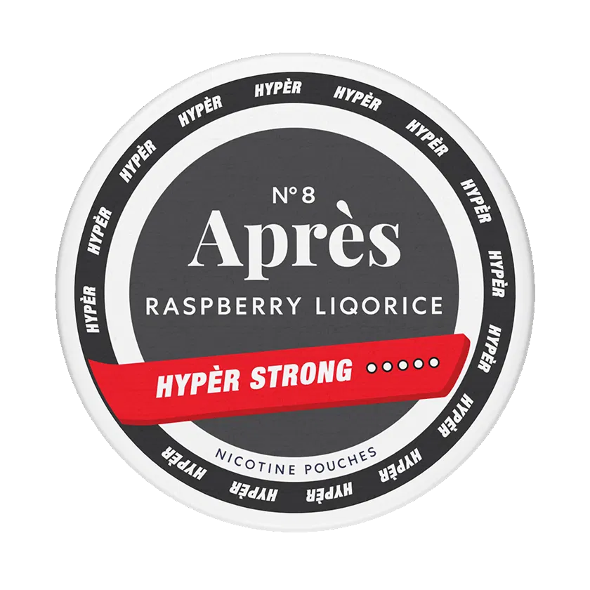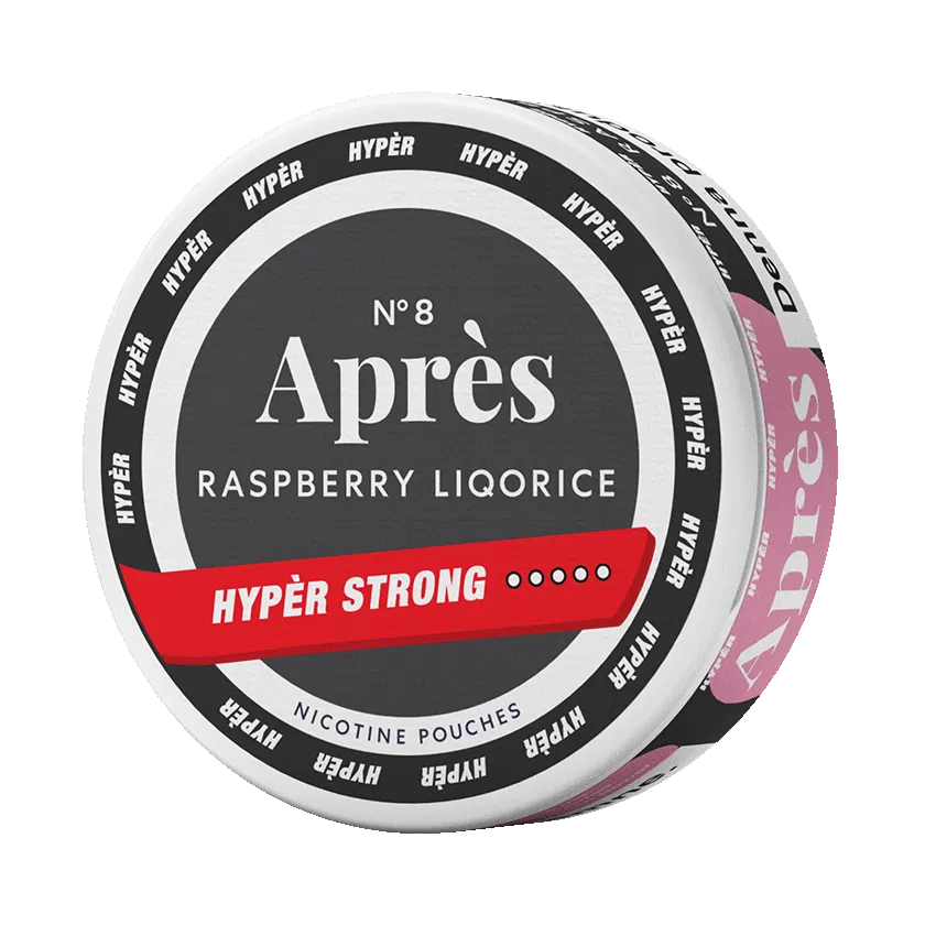 Après Raspberry Liqorice Hypèr Strong N°8 är ett vitt snus med smak av hallon och lakrits. Styrkan är extra stark och formatet är slim. Varje dosa innehåller 20 st portioner.