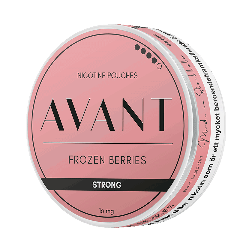 Avant Frozen Berries Strong är ett bäraromatiserat, tobaksfritt snus med stark styrka. Denna slim-formatprodukt levereras med 20 prillor per dosa.