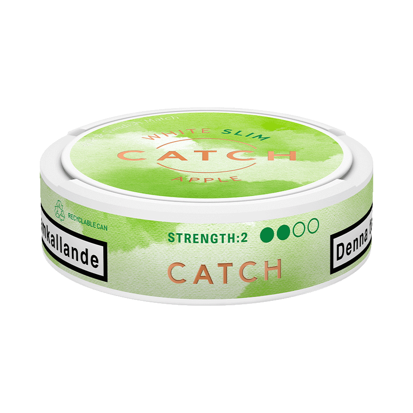 Catch Apple Slim White är ett tobakssnus av typen Vit Portion. Smaken är tobak, rött äpple och apelsin. Prillorna är i slimformat och styrkan är lite lägre än normal.