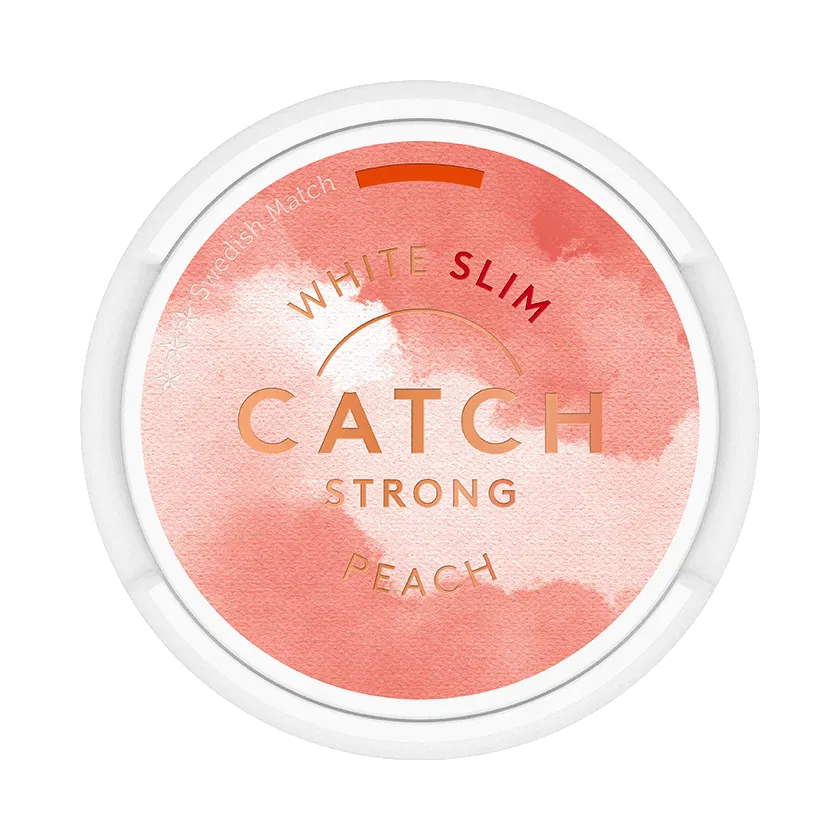 Catch Peach Strong Slim White är ett snus av typen Vit Portion med tobak. Smaken är tobak med inslag av persika, te och bergamott. Formatet är slim och stark styrka.