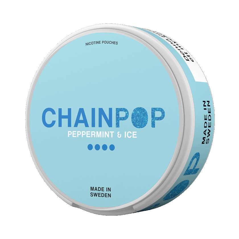 Chainpop Peppermint & Ice är ett vitt snus med smak av menthol och pepparmint. Nikotinpåsarna är i formatet slim och styrkan extra stark.