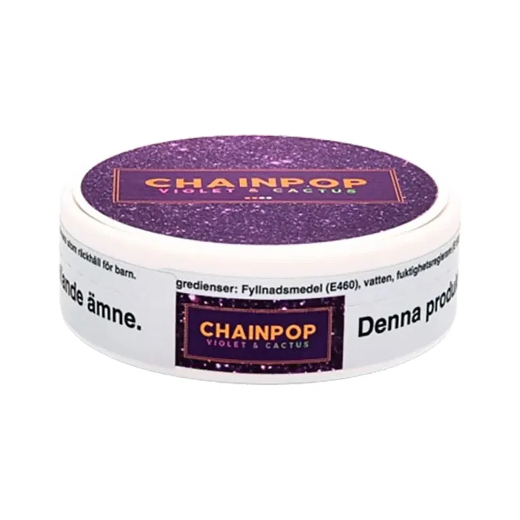 Chainpop Violet & Cactus är ett vitt tobaksfritt snus med smak av viol och kaktus. Formatet är slim och styrkan normal. Varje dosa innehåller 20 st nikotinpåsar. OBS! Kort datum, 2026-01-29.