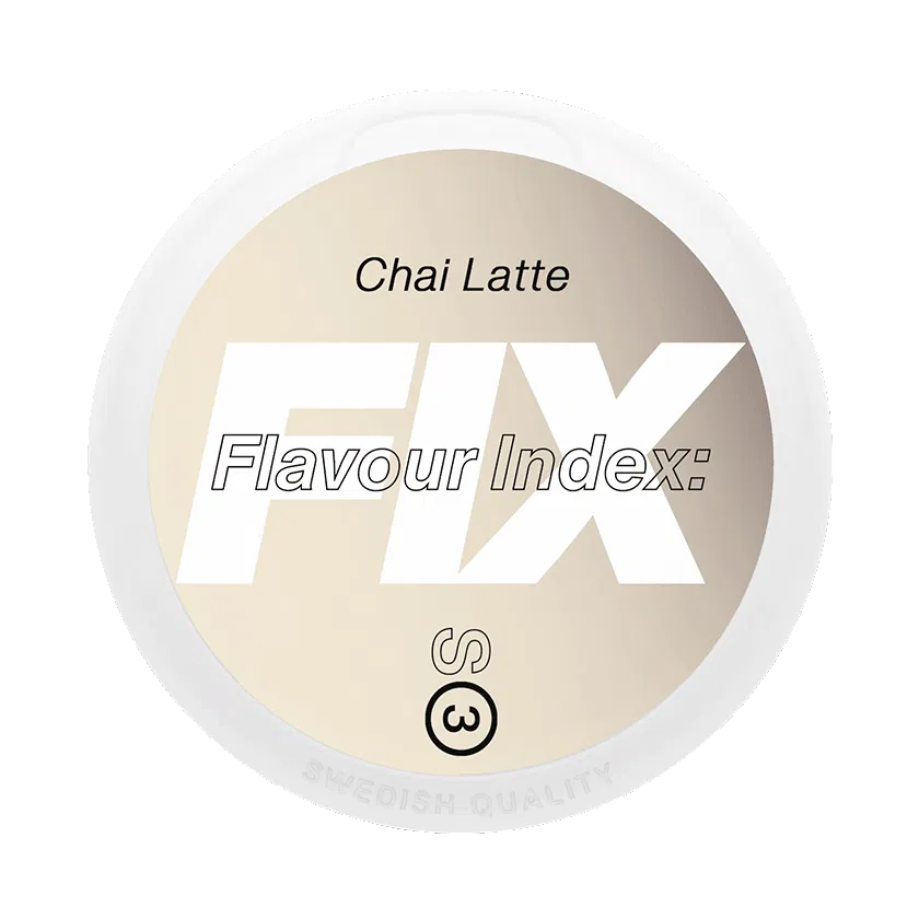 FIX Chai Latte S3 är en nikotinpåse fri från tobak. Det vita snuset består av växtfiber och har en torr yta, ett fuktigt innehåll och låg rinnighet. I den slimmade påsen finns tillsatt nikotin samt aromer av kaffe chai-kryddor som kanel och nejlika. En dosa innehåller 20 nikotinpåsar.