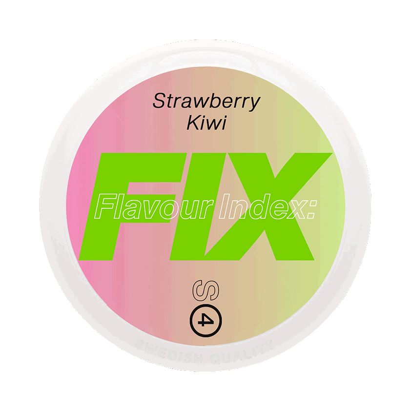 FIX Strawberry Kiwi S4 är ett vitt snus fritt från tobak. Det är smaksatt av jordgubb, melon, lychee samt guava. Varje dosa innehåller 20 portioner och dessa har ett slim format och styrkan är extra stark.