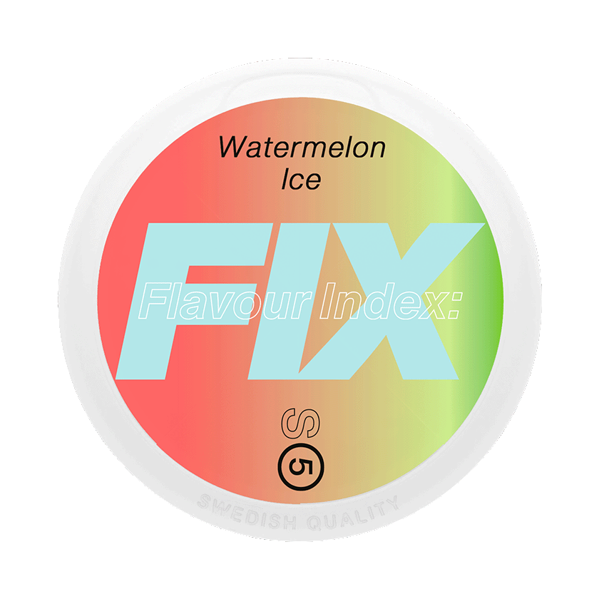 FIX Watermelon Ice S5 är ett vitt snus fritt från tobak. Det är smaksatt av vattenmelon, gröna äpplen, lychee samt guava. Varje dosa innehåller 20 portioner och dessa har ett långsmalt format med hög nikotinhalt.