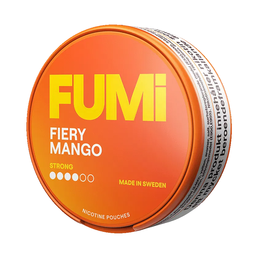 FUMi Fiery Mango Strong är ett vitt snus som är fritt från tobak. Nikotinpåsarna har ett slim format och styrkan är stark. Smaken är en kombination av mango och chili.