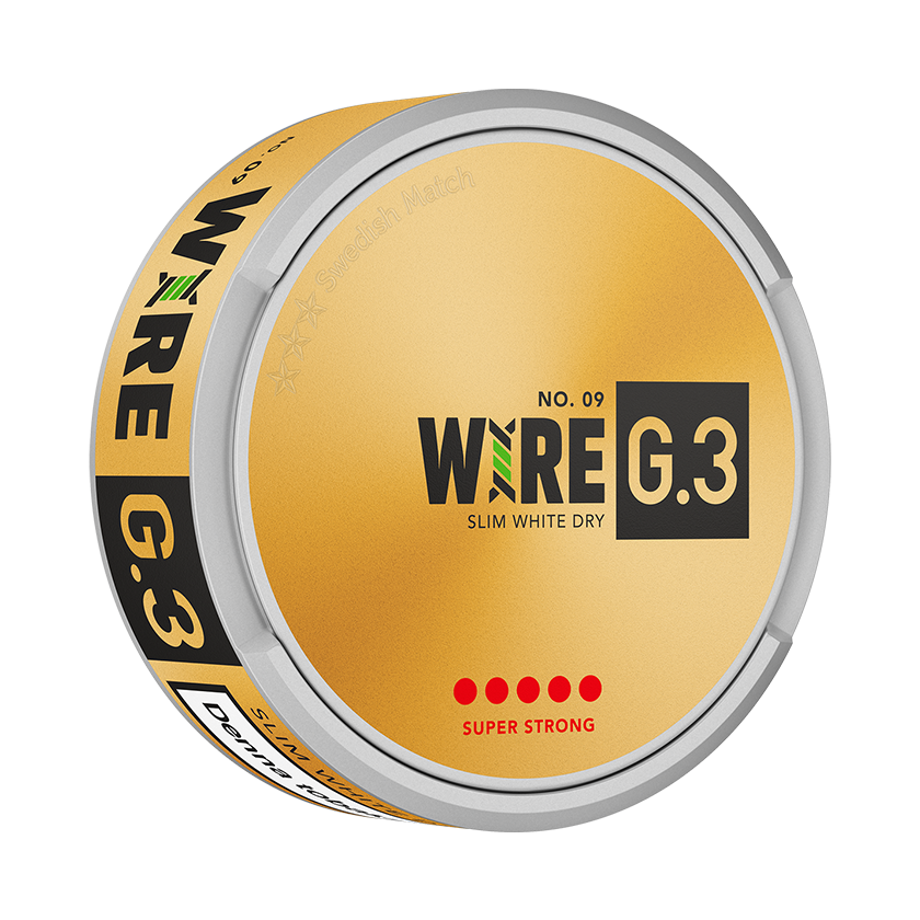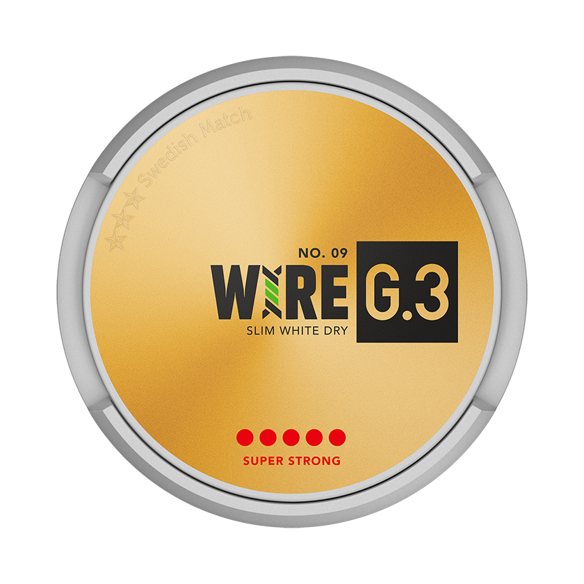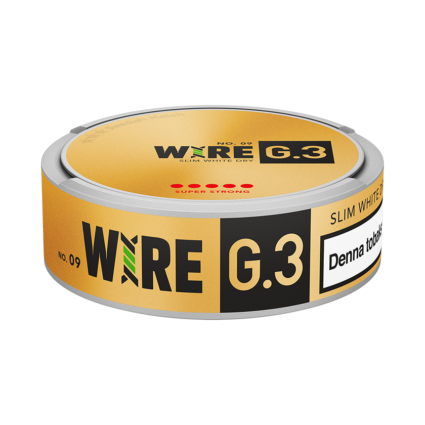 G.3 WIRE Slim White Dry Super Strong är ett snus av typen white portion. Portionspåsarna är 24 till antalet i varje dosa är i slimformat. Detta snus innehåller tobak samt nikotin och har en smak av tobak, torkad frukt och röda bär. Styrkan är extra stark.