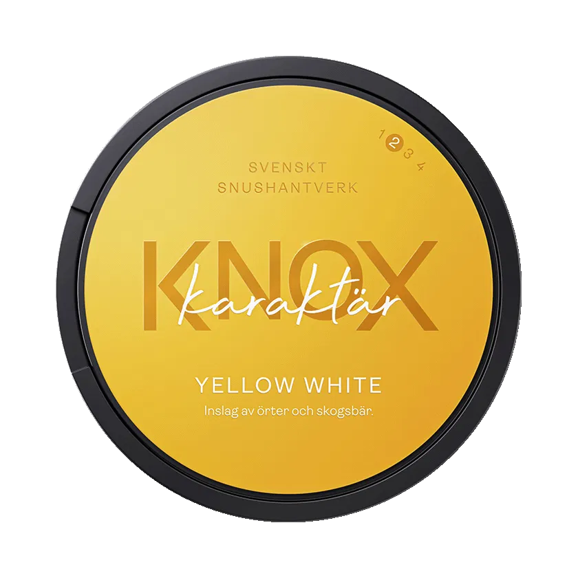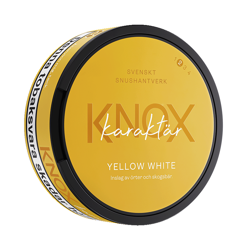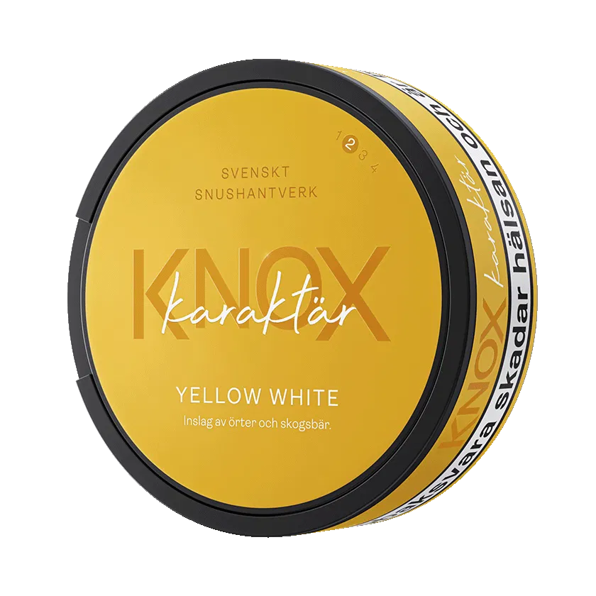 Knox Karaktär Yellow White är ett svensktillverkat White Portion-snus från Skruf Snus. Det har en tobakssmak med inslag av örter och vilda bär.