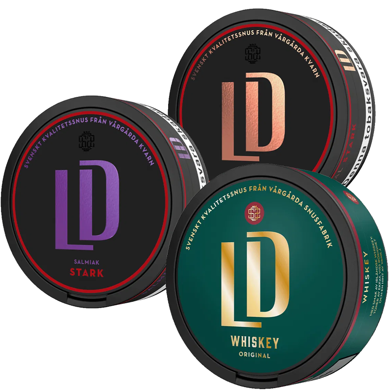 LD mixpack med tre olika smaker; Whiskey Original, Salmiak Stark och Original Stark. Dessa portionspåsar innehåller både tobak och nikotin.