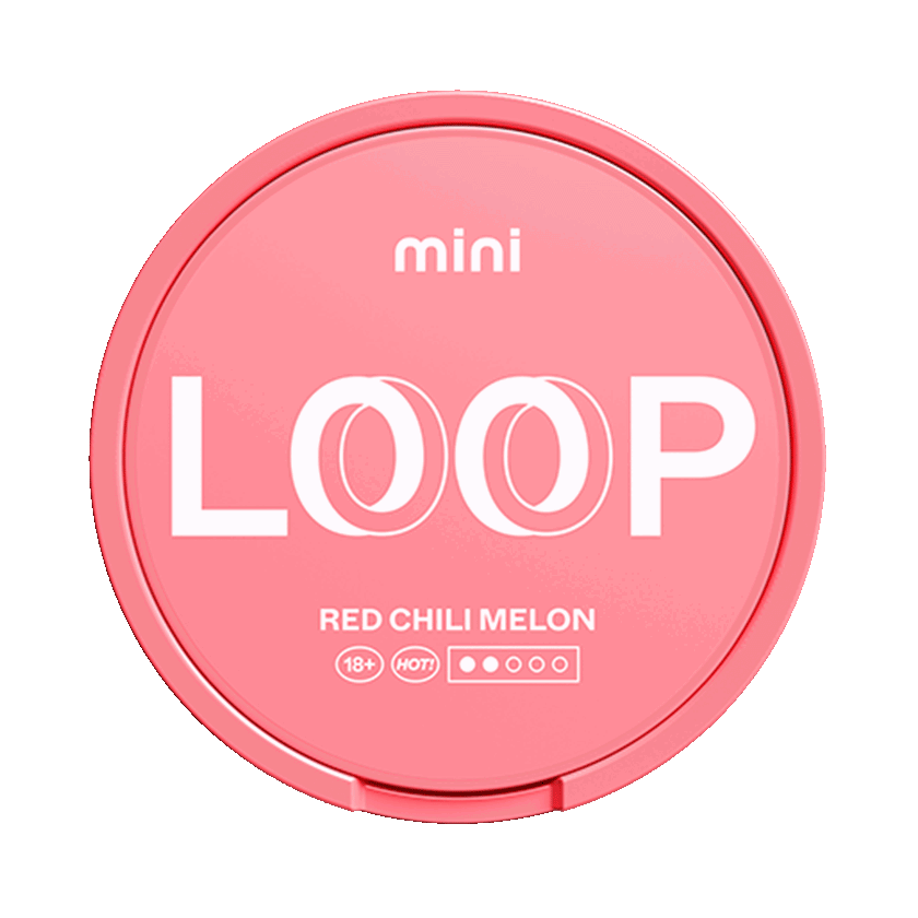 Loop Red Chili Melon Mini är ett tobaksfritt alternativ med smak av melon och chili. Dessa portioner i miniformat av vitt snus är utformade för att passa under läppen och har en fuktig insida och en torrare utsida för att minska läckage i munnen. Styrkan klassas som normal.