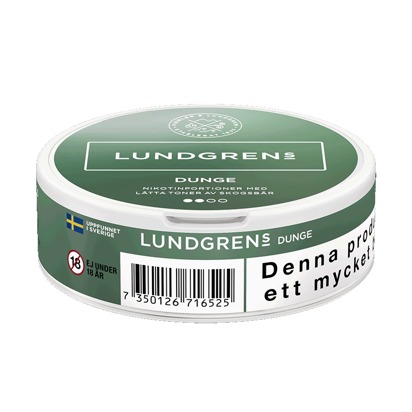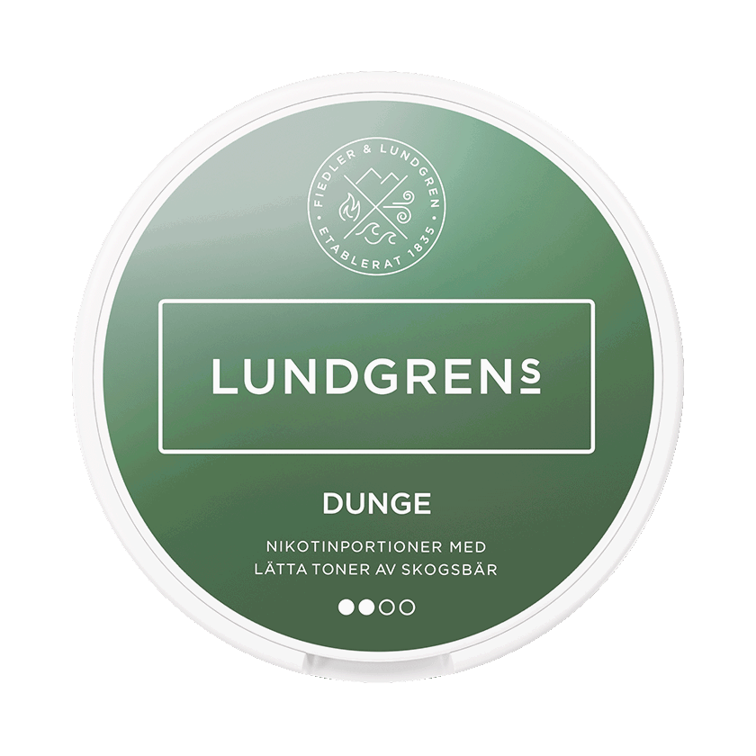 Lundgrens Dunge är ett vitt snus med smak av skogsbär Snuset är i normalformat, vilket ger en god passform under läppen för ökad komfort. De 21 vita, torra prillorna är utformade för att ge en jämn frisättning av både smak och nikotin över tid.