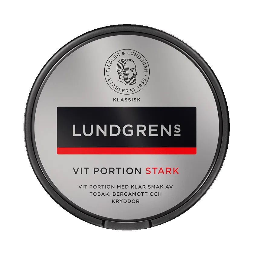 Lundgrens Vit Portion Stark från varumärket Lundgrens har smak av tobak, bergamott och kryddor i normalformat. Stark styrka och varje dosa innehåller 22 snusprillor.