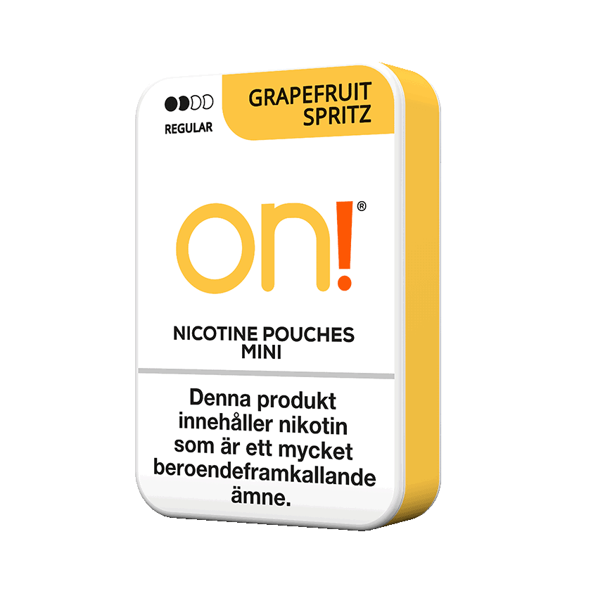 on! Grapefruit Spritz Regular Mini är ett vitt tobaksfritt snus. Smak av grapefrukt och vita vinbär. Prillorna är i mini-format med normal klassificering.
