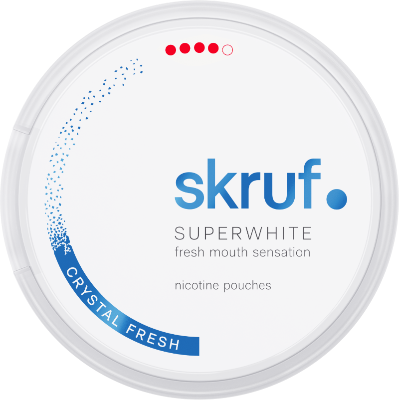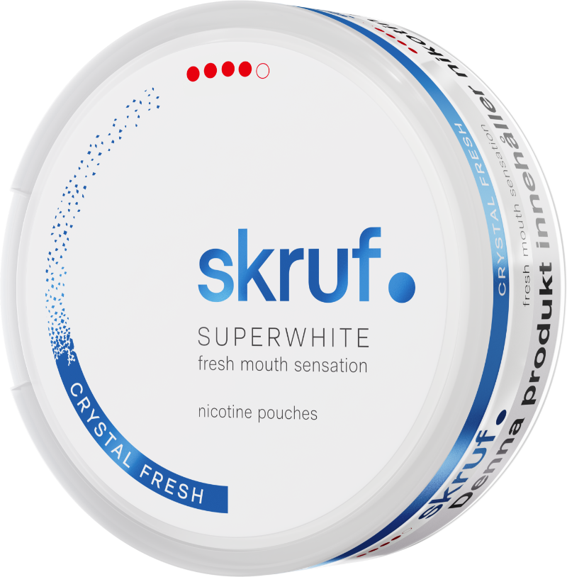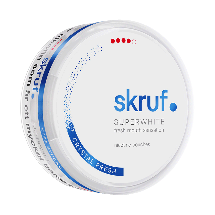 Skruf Superwhite Crystal Fresh Extra Strong är ett vitt snus med extra stark styrka. Smak av eukalyptus och mynta och helt fri från tobak. Nikontinpåsarna har ett slim format.