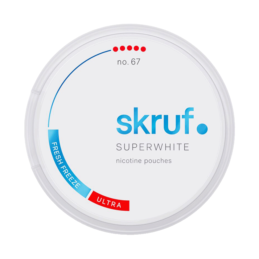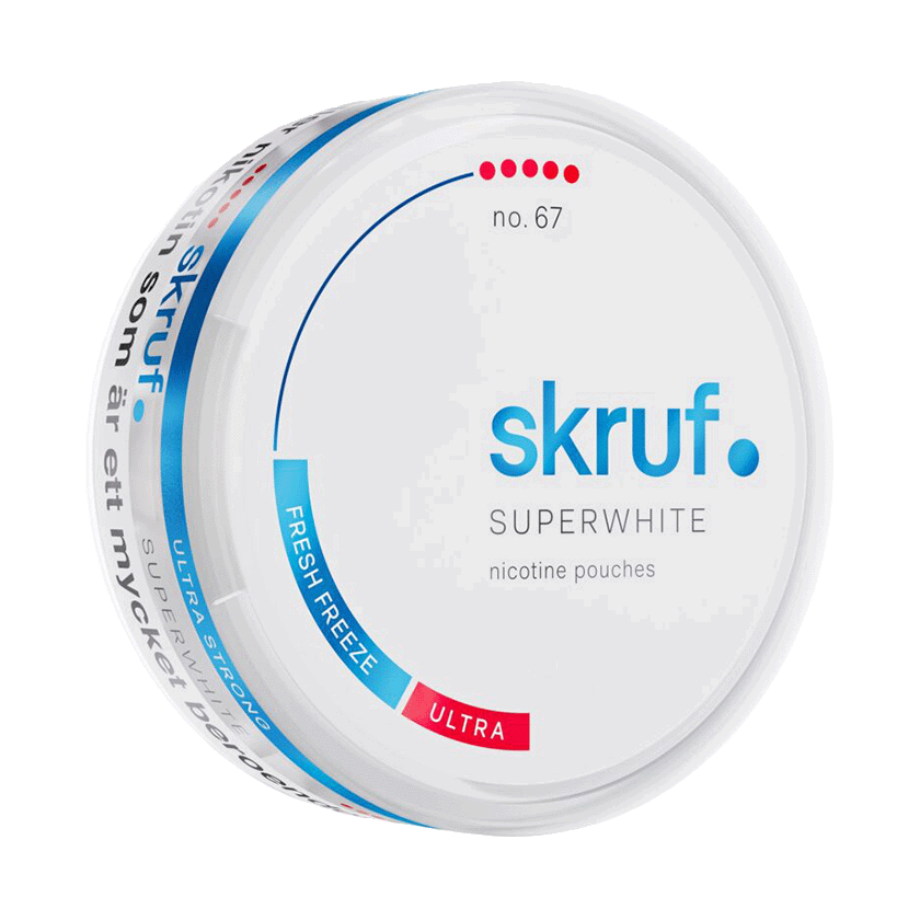 Skruf Superwhite No. 67 Fresh Freeze Ultra är ett tobaksfritt vitt snus med smak av pepparmint, menthol och spearmint. Formatet är slim och styrkan karaktäriseras som extra stark. Varje dosa innehåller 24 st nikotinpåsar.