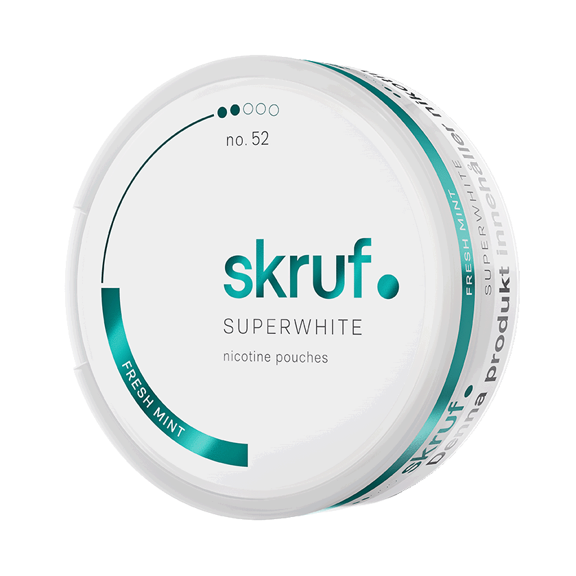 Skruf Superwhite No. 52 Fresh Mint är ett tobaksfritt vitt snus med smak av mint. Formatet är slim och styrkan karaktäriseras som normal.