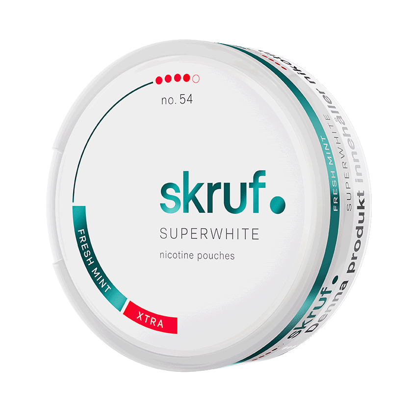 Skruf Superwhite No. 54 Fresh Mint Xtra Strong är ett vitt snus med styrka som är extra stark. Smak av mint och helt fri från tobak.