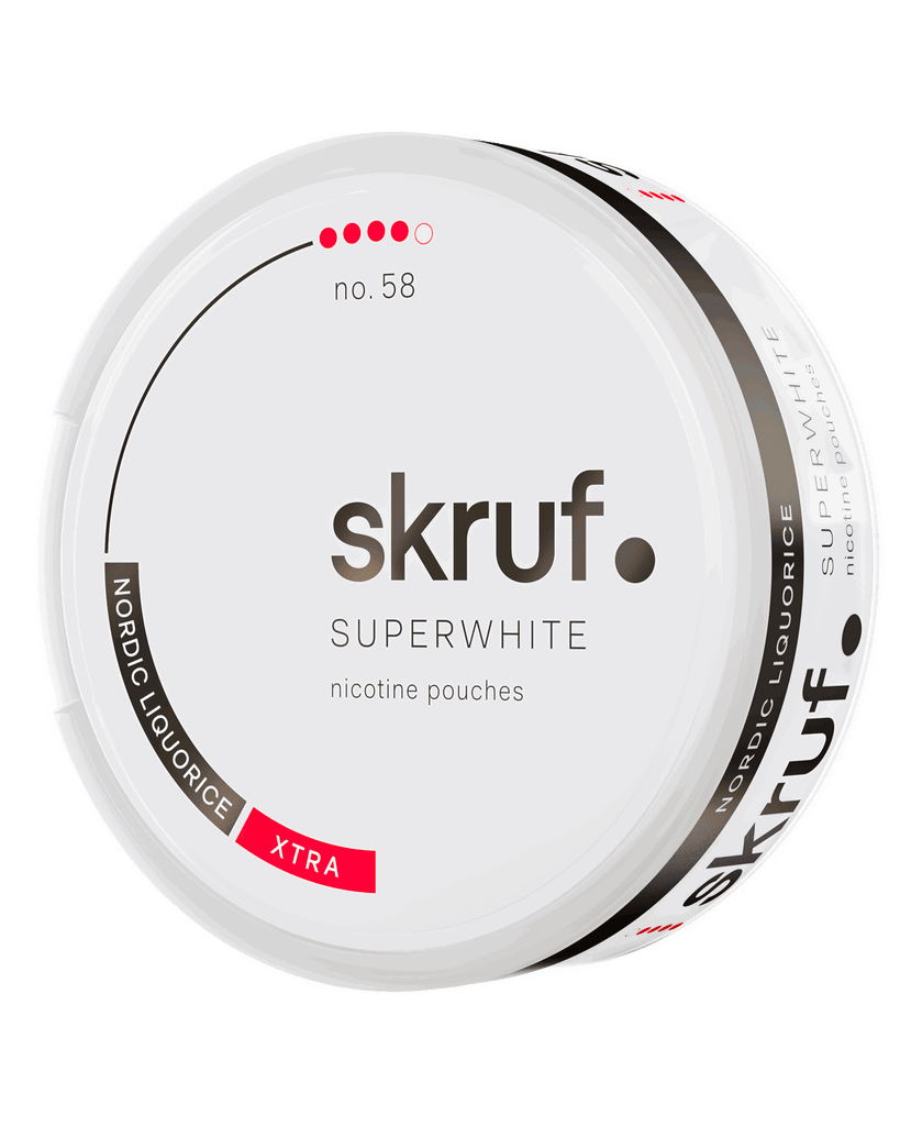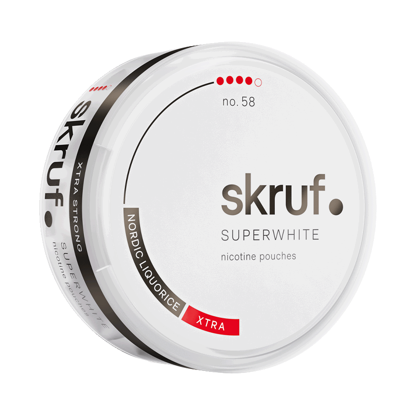 Skruf Superwhite No. 58 Nordic Liquorice Xtra Strong är ett tobaksfritt vitt snus med smak av lakrits. Formatet är slim och styrkan karaktäriseras som extra stark.