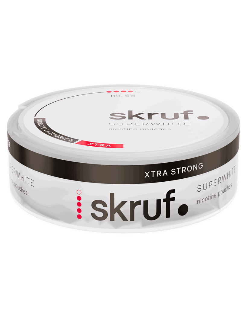 Skruf Superwhite No. 58 Nordic Liquorice Xtra Strong är ett vitt snus med styrka som är extra stark. Smak av lakrits och helt fri från tobak.