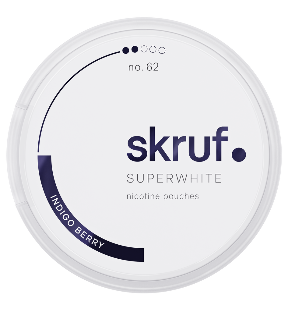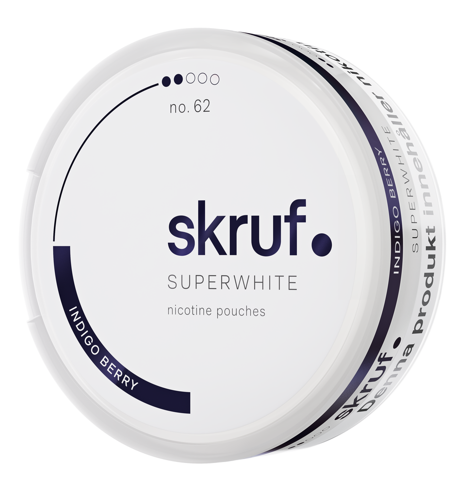 Skruf Superwhite No. 62 Indigo Berry är ett vitt snus med styrka som är normal. Smak av björnbär, mint och lakrits och helt fri från tobak.