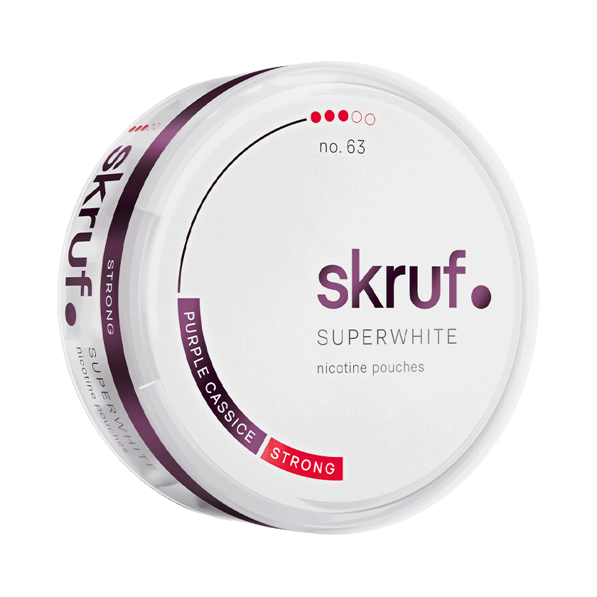 Skruf Superwhite No. 63 Purple Cassis Xtra Strong är ett vitt snus med styrka som är extra stark. Smak av svarta vinbär och helt fri från tobak.