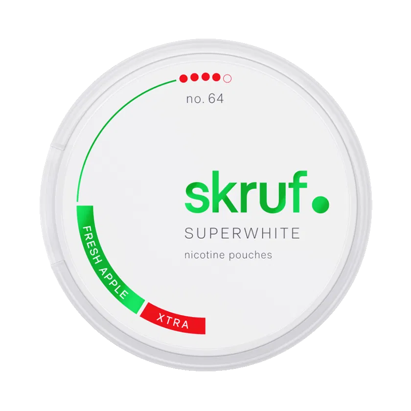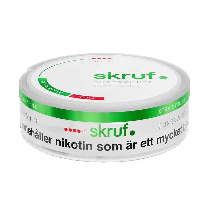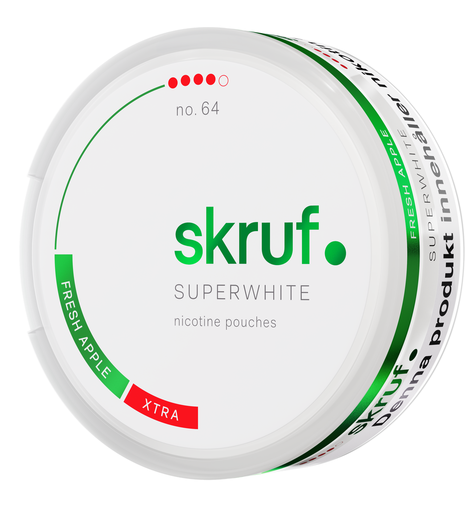Skruf Superwhite No. 64 Fresh Apple Xtra Strong är ett tobaksfritt vitt snus med smak av äpple och mint. Formatet är slim och styrkan karaktäriseras som extra stark.
