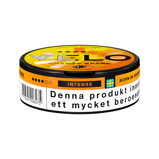 VELO Orange Spark ett vitt snus som är fritt från tobak. Det tillverkas av BAT och har ett slim-format med extra stark styrka. Smaken är citrus och apelsin.
