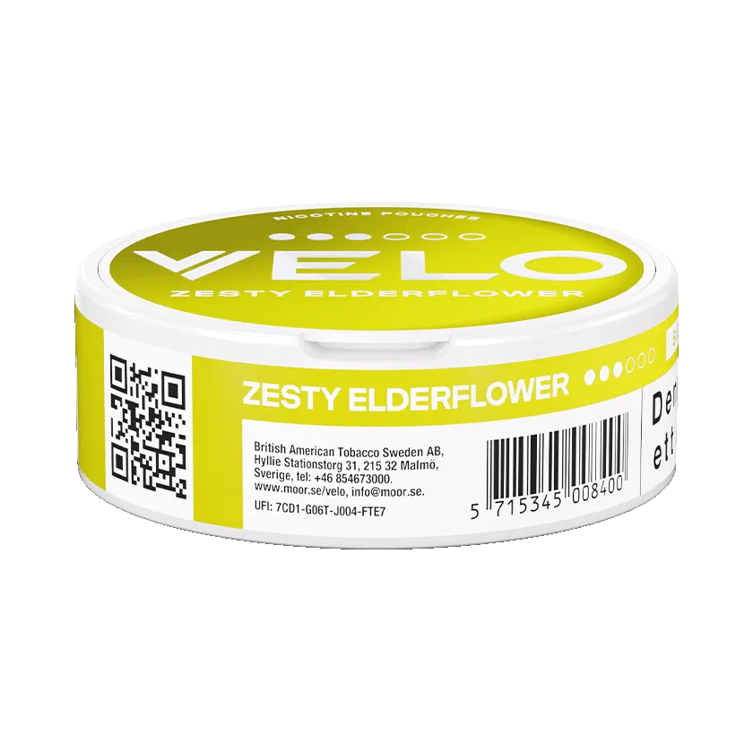 VELO Zesty Elderflower är ett vitt snus utan tobak. Smak av fläder och lime i ett slim-format med stark styrka.