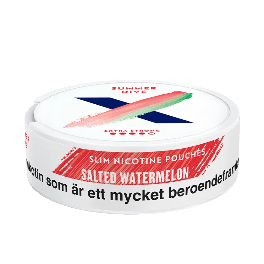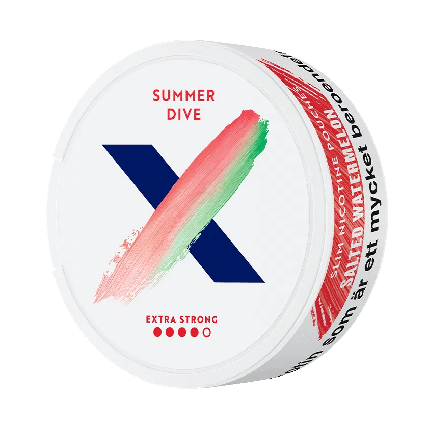 X Summer Dive Extra Strong är ett vitt snus med smak av salt vattenmelon. Formatet är slim och styrkan extra stark.