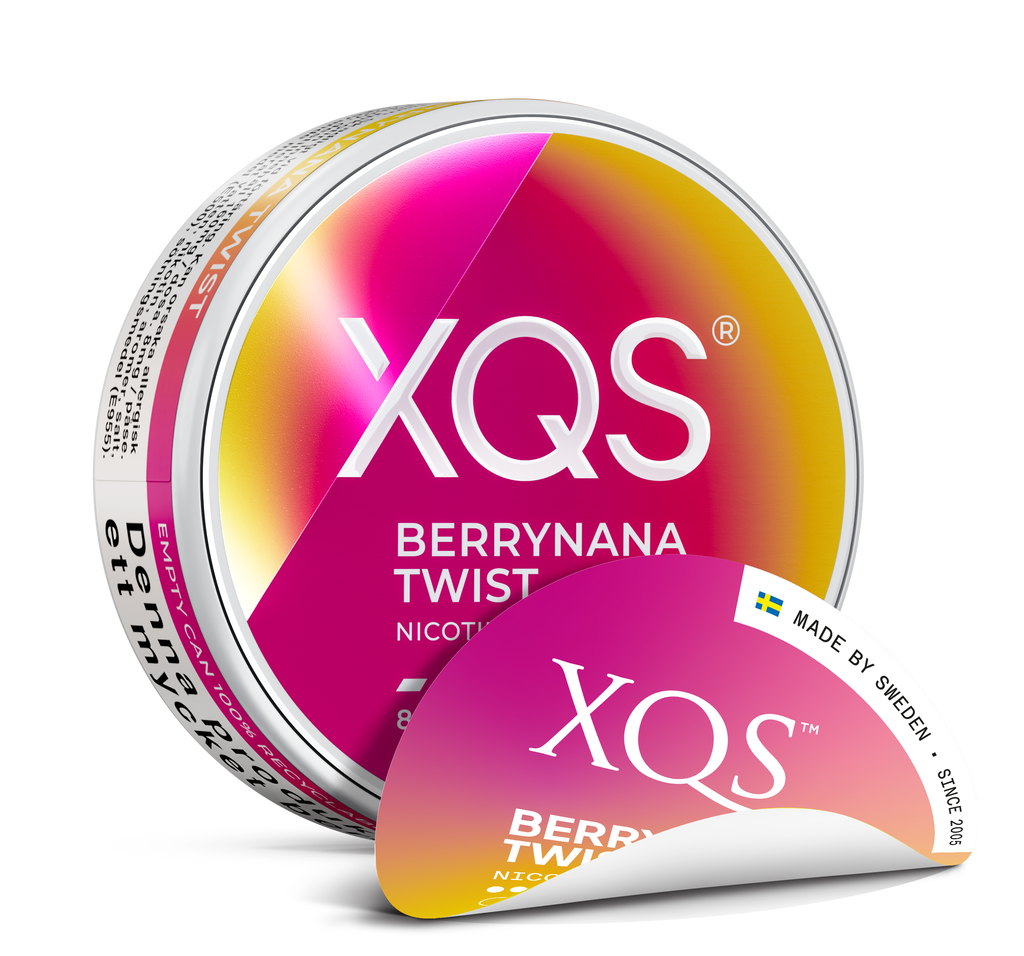 XQS Berrynana Twist Slim 8 MG är ett vitt snus med smak av jordgubb, banan och bär. Det är ett vitt snus utan tobak med prillor i slim-format. Dessa slimmade portioner har ett nikotininnehåll på 16 mg per gram.
