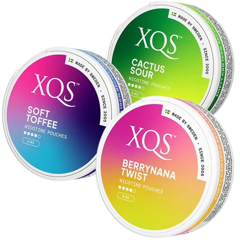 XQS Mixpack 3-pack innehåller 3 stycken snusdosor vitt snus: XQS Berrynana Twist, Soft Toffee och Cactus Sour. Slim format och stark styrka.