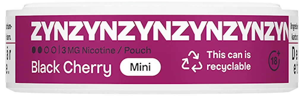 ZYN Black Cherry Mini Normal är ett vitt snus, fritt från tobak. Smaken är körsbär, skogsbär och vanilj. Styrkan är normal. Formatet är mini.