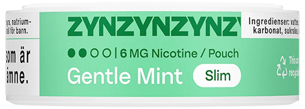 ZYN Gentle Mint Slim Normal är ett vitt snus, fritt från tobak. Smaken är spearmint och vanilj. Styrkan är normal, formatet slim.