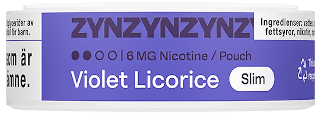 ZYN Violet Licorice Slim Normal är ett tobaksfritt vitt snus med smak av sötlakrits och viol. Formatet på prillorna är slim och styrkan är normal. Tillverkas av Swedish Match.
