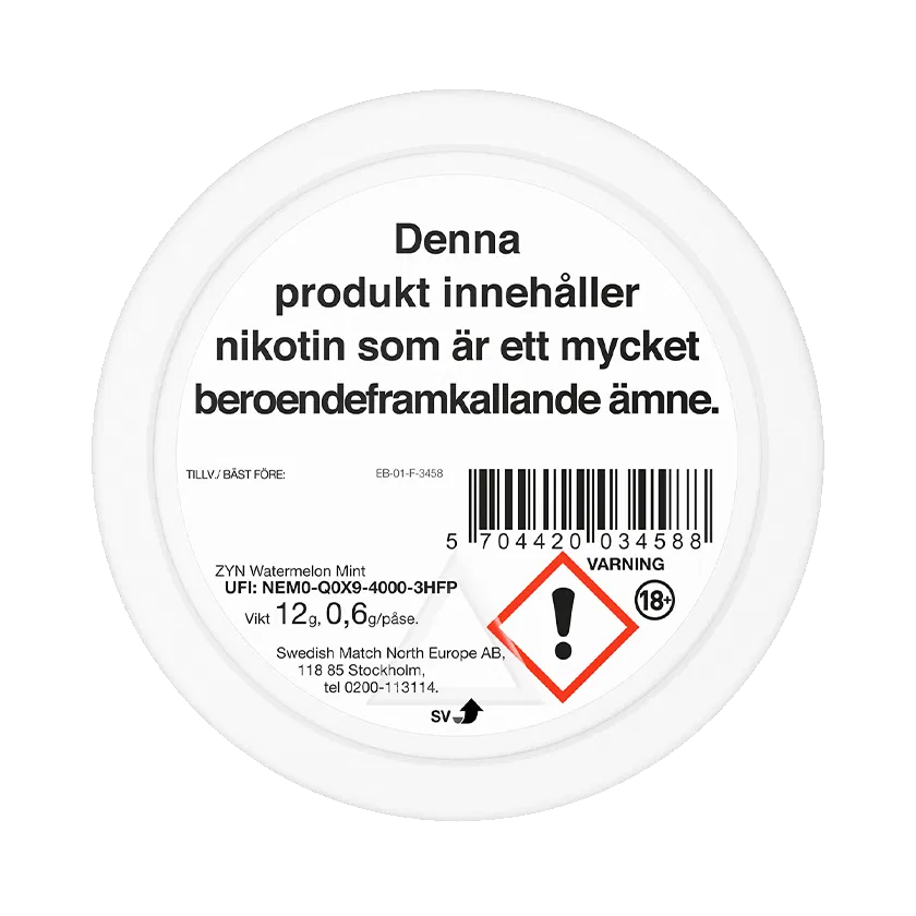 ZYN Watermelon Mint Slim S2 är ett tobaksfritt vitt snus med smak av vattenmelon och mint. Formatet på prillorna är slim och styrkan är normal. Varje dosa innehåller 20 st nikotinpåsar. Tillverkas av Swedish Match.